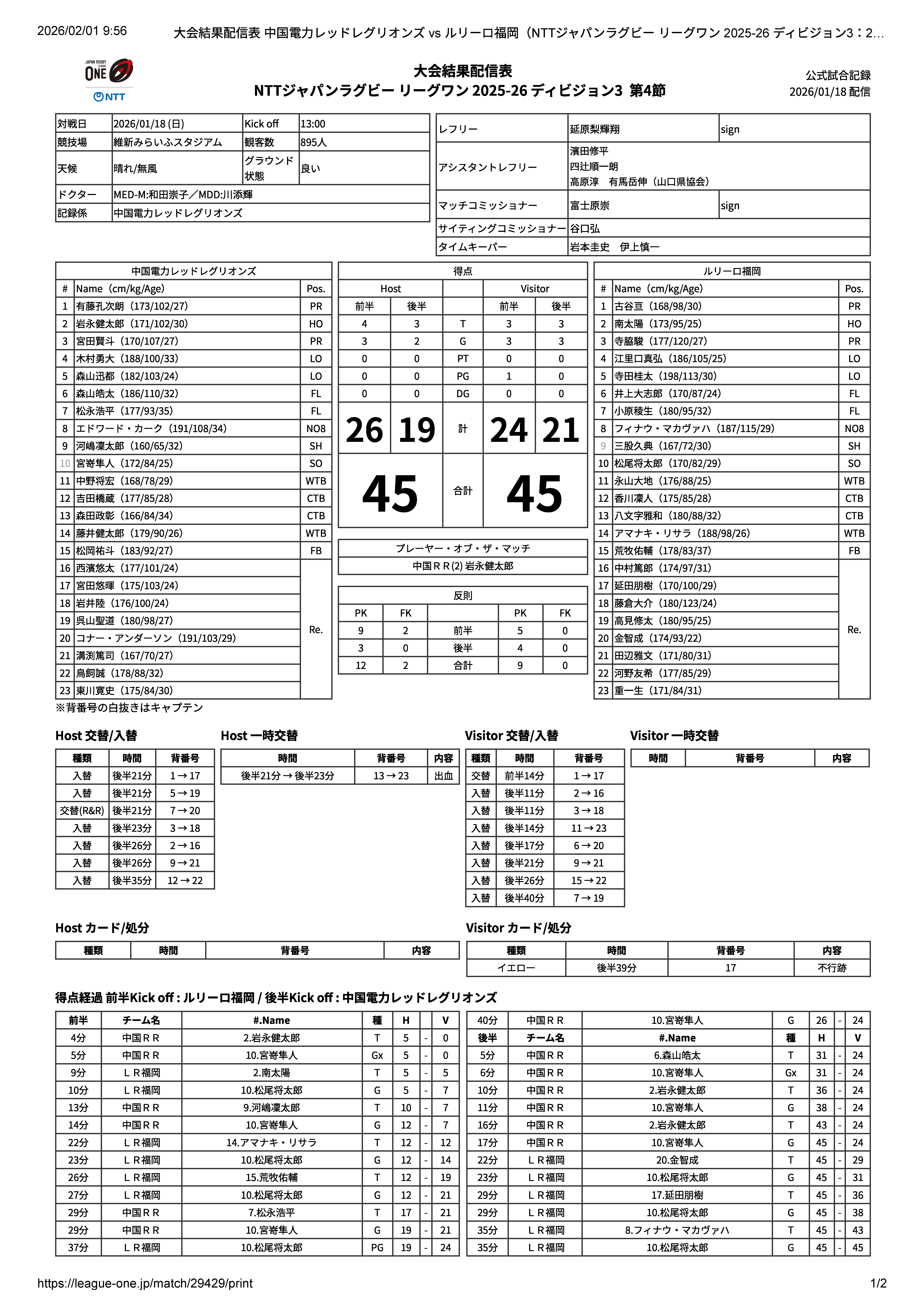 「本日はビジターゲームにもかかわらず、多くのご声援をいただき、ありがとうございました。LR福岡としては、80分間をとおして粘り強くタフに戦う中国RRさんに対し、受けに回らず、自分たちも最後までやり切ることをテーマに準備してきました。しかし、相手のプレッシャーを受ける中でペナルティを犯してしまい、そこからなかなかリズムをつかめないまま後半に入る形となりました。それでも、3トライ3ゴール差をつけられた状況から巻き返し、同点に追い付くことができました。その過程で、誰一人として気持ちが切れることなく、最後までやり遂げられた点は、チームとして大きな収穫であり、確かな成長を感じられる部分だと思います。この結果を前向きに捉え、次節に向けて、またしっかりと準備していきたいです」